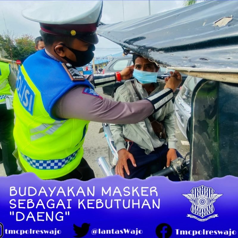 Masyarakat yang tidak memakai masker diberi masker sebagai pelindung dari Covid 19.Tak hanya diberi masker, Satlantas Polres Wajo juga membagikan makan sebagai asupan daya tahan tubuh.