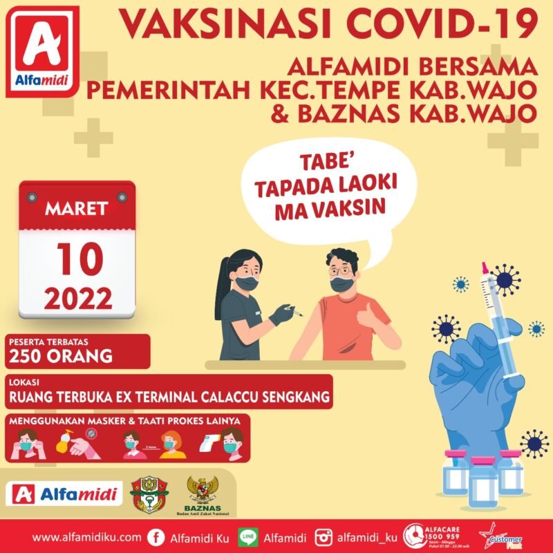 Camat Tempe Supardi yang dihubungi via telepon seluler membenarkan hal tersebut. “InsyaAllah besok pemerintah kecamatan tempe akan menggelar vaksinasi massal. Dalam vaksinasi massal besok kita kerjasama dengan Alfamidi dan Baznas Kabupaten Wajo,” ujarnya.