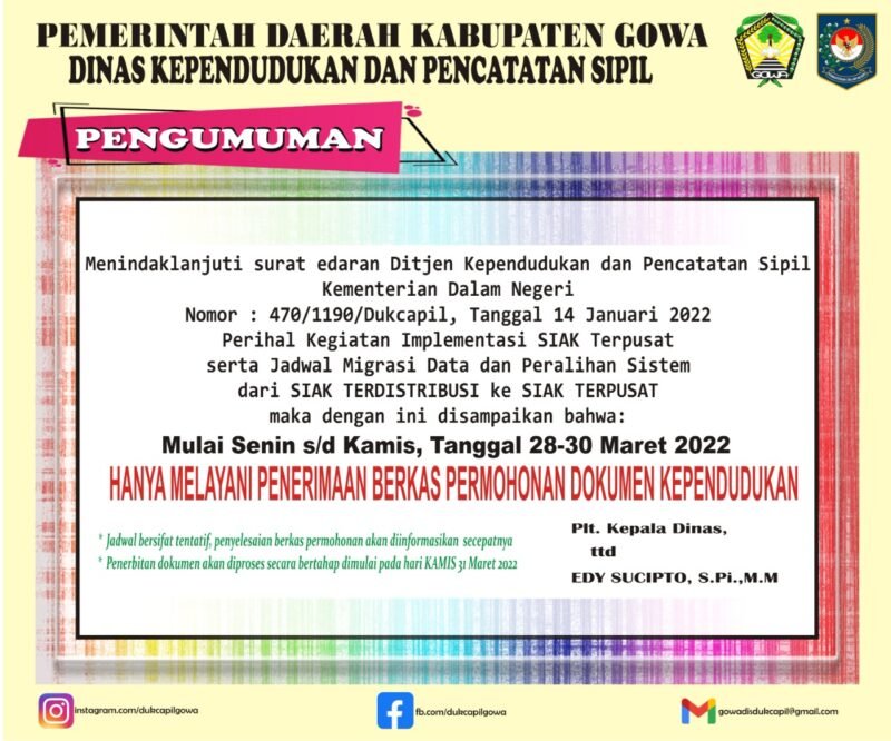 Pelaksana tugas (Plt) Kepala Dinas Dukcapil Kabupaten Gowa, Edy Sucipto mengatakan bahwa hal ini dilakukan karena akan ada maintenance server untuk migrasi dari Sistem Informasi Administrasi Kependudukan (SIAK) Terdistribusi ke SIAK terpusat.