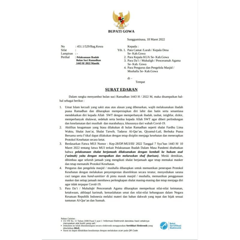 LINTASCELEBES.COM GOWA — Pemerintah Kabupaten (Pemkab) Gowa mulai memperbolehkan aktifitas keagamaan dilakukan seperti biasa pada bulan Ramadhan Tahun ini dengan tetap menerapkan protokol kesehatan. Hal ini berdasarkan Surat Edaran Bupati Gowa, Adnan Purichta Ichsan tentang Pelaksanaan Ibadah Bulan Suci Ramadhan 1443 H/ 2022 Masehi.