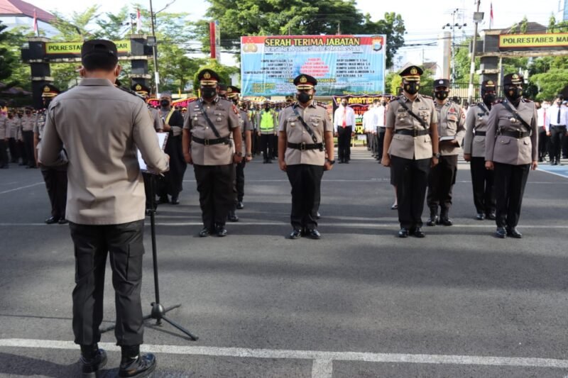 LINTASCELEBES.COM MAKASSAR — Kepala Kepolisian Resor Kota Besar Makassar Kombes Pol Budhi Haryanto, SIK, NH memimpin upacara serah terima jabatan (sertijab) pejabat utama (PJU) dan Kapolsek jajaran Polrestabes Makassar berlangsung di halaman Mapolrestabes Makassar, Kamis (24/03/2022).