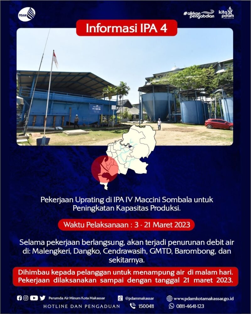 LINTASCELEBES.COM MAKASSAR — PDAM Kota Makassar menginformasikan akan terjadi penurunan debit air karena adanya pekerjaan uprating di IPA 4 Maccini Sombala sejak tanggal 3 – 21 Maret 2023.