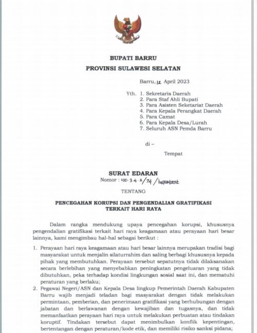 LINTASCELEBES.COM BARRU — Menindaklanjuti Surat Edaran KPK-RI Nomor 06 Tahun 2023 tanggal 30 Maret 2023 tentang Pencegahan Korupsi dan Pengendalian Gratifikasi Terkait Hari Raya, Bupati Barru menerbitkan Surat Edaran Nomor 100.3-4.2/71/Inspektorat Tanggal 12 April 2023 tentang Pencegahan Korupsi dan Pengendalian Gratifikasi Terkait Hari Raya.