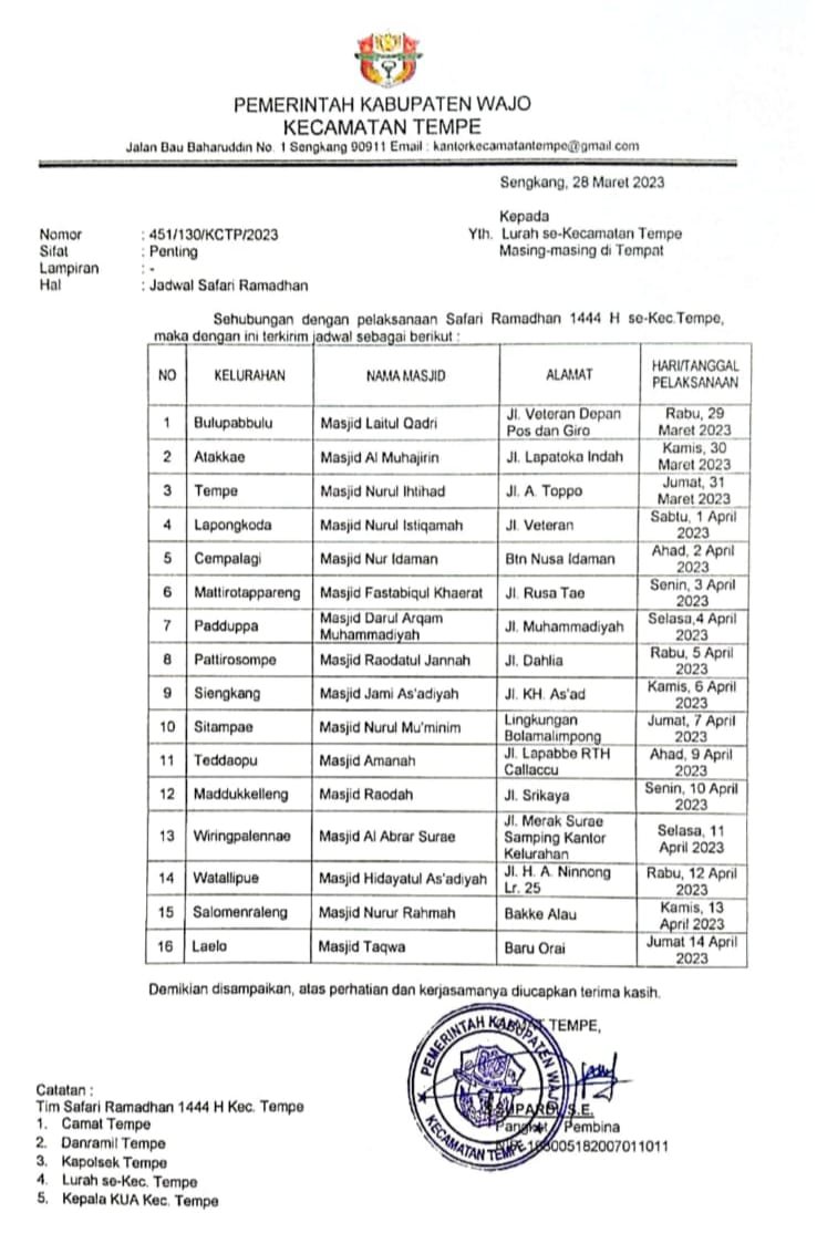 Jadwal Safari Ramadhan Pemerintah Kecamatan Tempe Tahun 1444 H / 2023 M