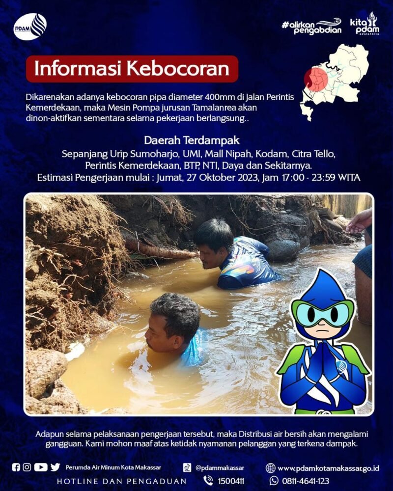 Kabag Humas PDAM Kota Makassar, Idris Tahir mengatakan estimasi pengerjaan kebocoran pipa Jumat 27 Oktober 2023 dari pukul 17:00 – 23:59 Wita.