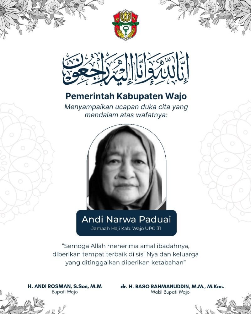 MEDIASINERGI.CO WAJO — Pemerintah Kabupaten Wajo berduka. Salah seorang warganya, Andi Narwa Paduai, wafat di Tanah Suci saat menunaikan ibadah haji.