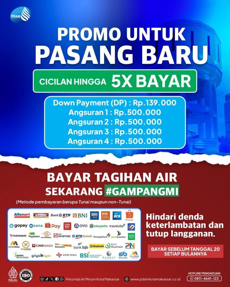 LINTASCELEBES.COM MAKASSAR — Perusahaan Daerah Air Minum (PDAM) Kota Makassar kembali menghadirkan promo pemasangan sambungan baru air bersih yang sangat terjangkau. Melalui program ini, pelanggan baru dapat menikmati kemudahan pembayaran dengan sistem cicilan hingga 5 kali.