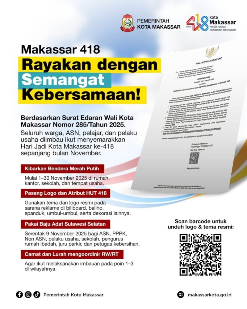 LINTASCELEBES.COM MAKASSAR —  Peringatan Hari Ulang Tahun ke-418 Kota Makassar, yang digelar tanggal 9 November mendatang, menjadi momentum reflektif bagi pemerintah kota untuk semakin mendekatkan diri kepada masyarakat.z