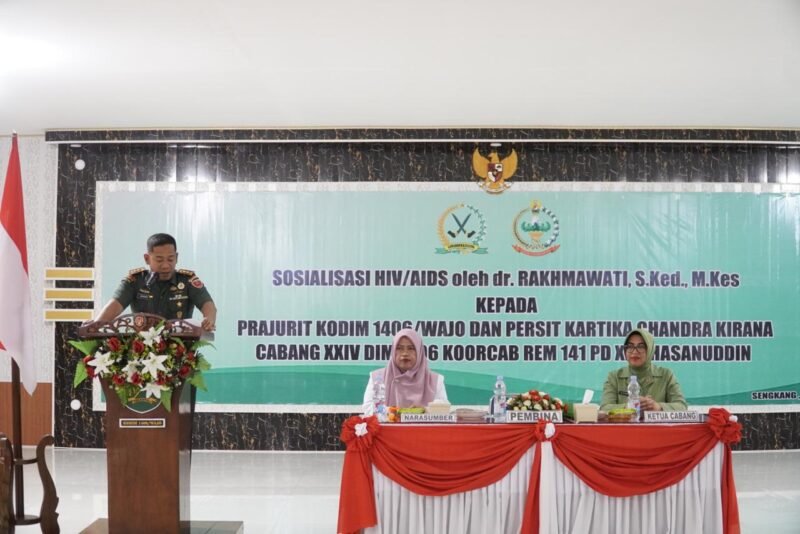 LINTASCELEBES.COM WAJO — Komando Distrik Militer (Kodim) 1406/Wajo menggelar sosialisasi HIV/AIDS sebagai upaya meningkatkan pemahaman dan kewaspadaan prajurit beserta keluarga terhadap bahaya penyakit menular tersebut. Kegiatan ini berlangsung pada Kamis, 18 Desember 2025, bertempat di Gedung Serbaguna Makodim 1406/Wajo, Jalan Kejaksaan No. 55, Kelurahan Bulupabbulu, Kecamatan Tempe, Kabupaten Wajo.