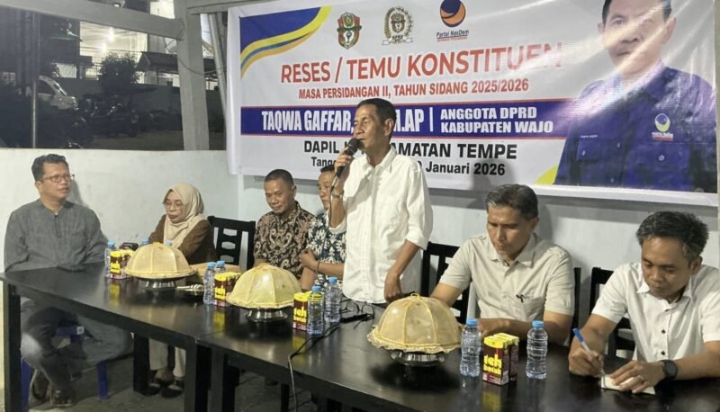 LINTASCELEBES.COM WAJO – Suasana emosional mewarnai reses anggota DPRD Kabupaten Wajo dari Fraksi Nasdem, Taqwa Gaffar, yang digelar di Jalan Belibis, Kelurahan Sengkang. Ratusan warga dari 16 kelurahan di Kecamatan Tempe memadati lokasi yang disebut Taqwa sebagai “Rumah Perjuangan”—posko yang menjadi saksi bisu kemenangannya di Pileg 2024 lalu.